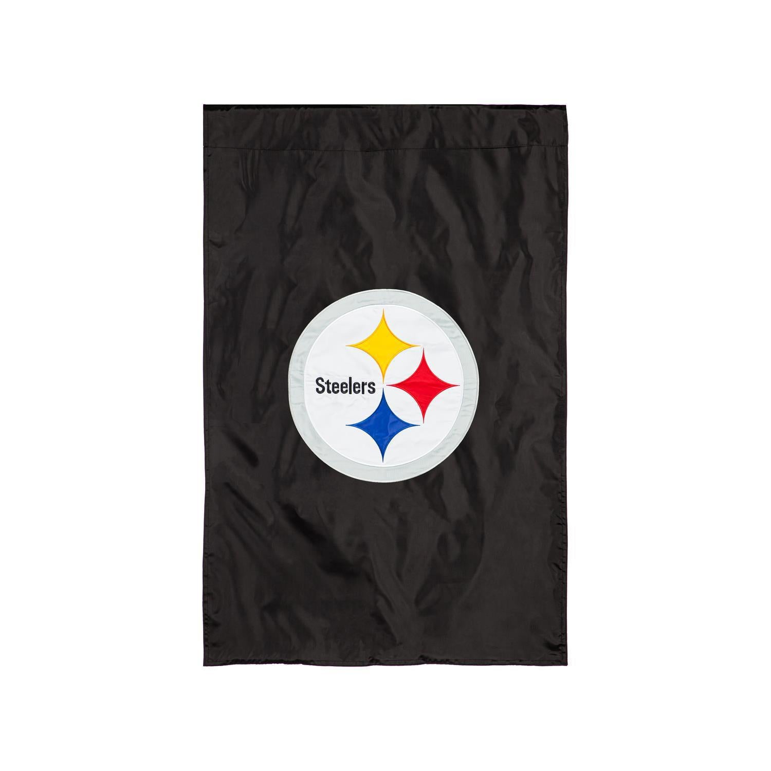 Get ready for gameday with this Pittsburgh Steelers Applique House Flag that's perfect for showcasing team pride any time of year. Featuring officially-licensed team colors and logo, this flag is ideal for any fan. Each Evergreen Flag applique flag is carefully crafted from multiple layers of 310 denier nylon that can withstand a variety of weather conditions. We combine pieces of fade-resistant, strong fabric with tight, detailed stitching to create a dimensional mosaic effect. The soft yet heavyweight material illuminates beautifully in sunlight. Each flag features a sleeve that fits standard flagpoles or stands, sold separately.