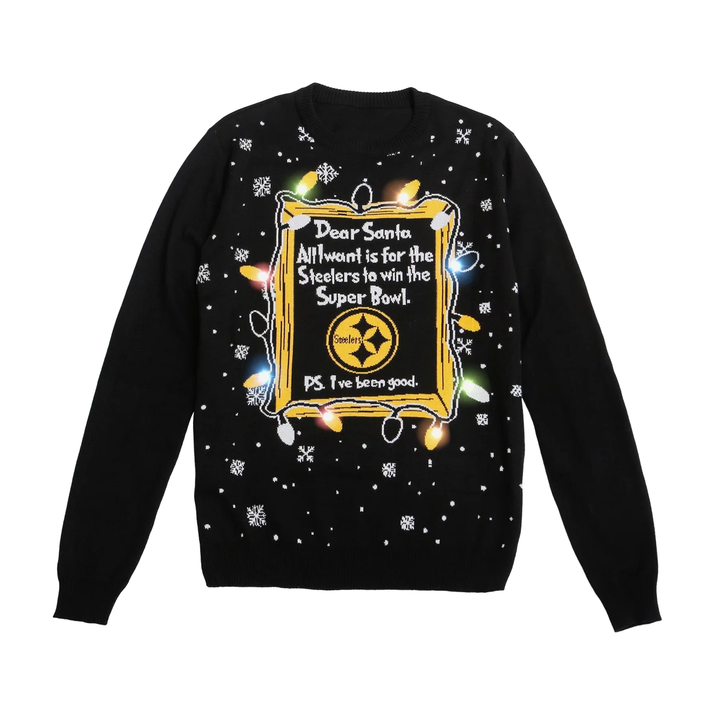 The holidays are coming, and you need a nice holiday sweater so Santa knows you belong on the nice list this year. This Pittsburgh Steelers Dear Santa Light Up Sweater is here to help, whether you're wrapping some gifts or being the star of the Christmas sweater party!
